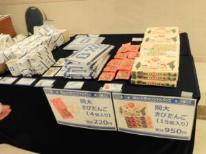 今回の総会・懇親会では、初めての試みとして「岡大グッズ」の紹介と販売が行われました。「おお岡大」ブランドの酒類や菓子、文具など多彩なグッズが並び、参加者は懐かしい思い出を語りながら楽しんでいました。