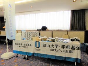 会場においては、新たな取り組みとして大学事務局より岡大グッズの販売コーナーの設置がありました。農学部の農場で栽培された酒米を使用した純米大吟醸酒「おお岡大」が、販売開始早々に売り切れてしまうなど好評を博しました。来年度も、たくさんの方にご参加をいただきたいと願っております。